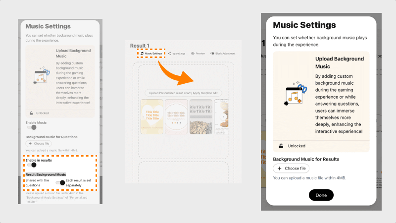 You can choose to make the result page “Share with the questions”, or let “Each result is set separately” with different background music.